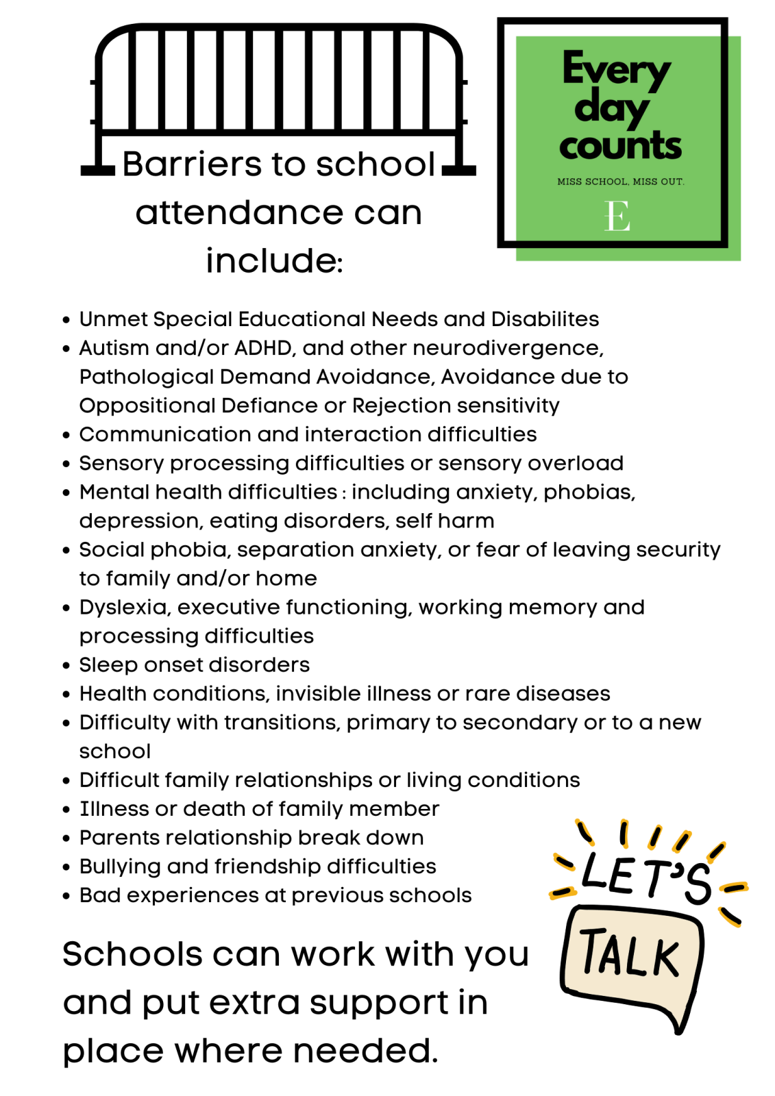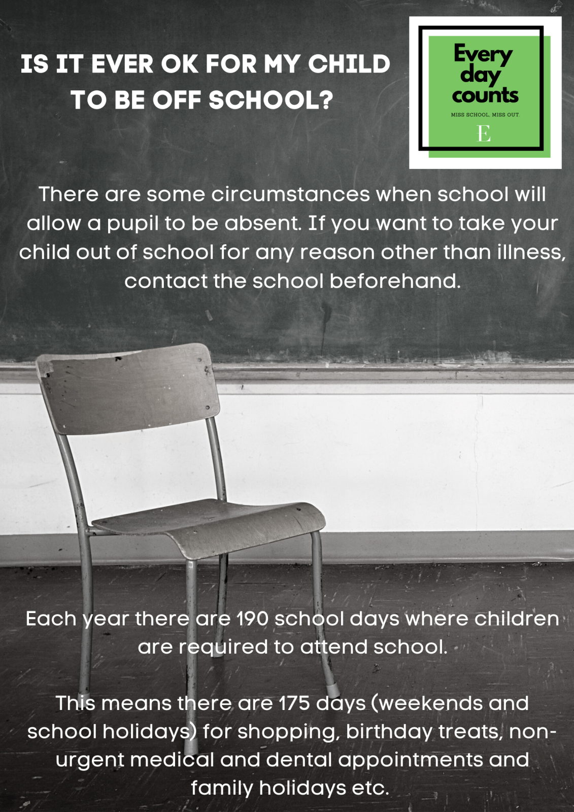 A child who misses 2 days of school a month is considered to have 'persistent absence' and will trigger the beginning of our attendance procedure and could have profound consequences for parents and carers.